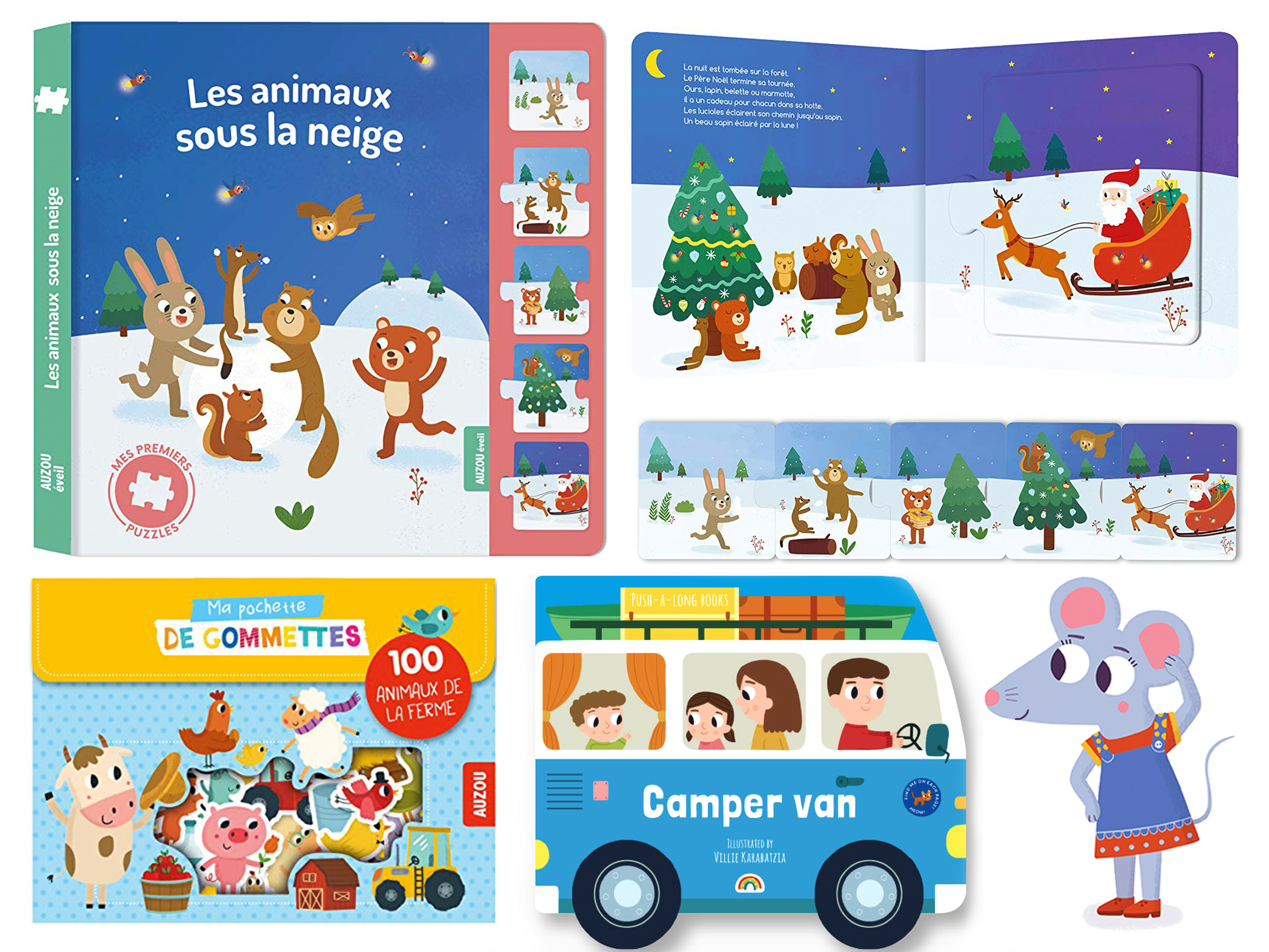 books with flaps and sounds, puzzles, children's magazines and book covers (YA and fiction).